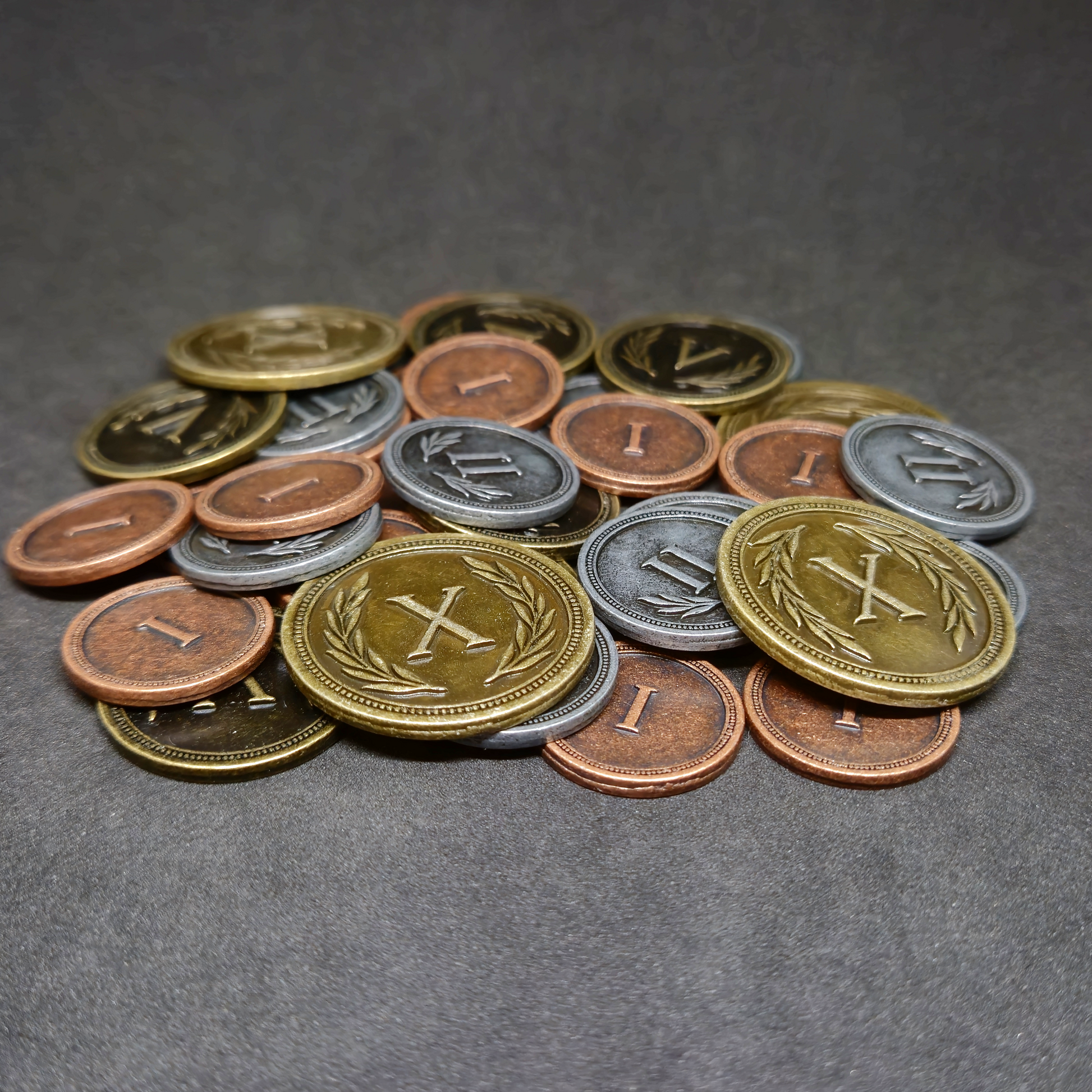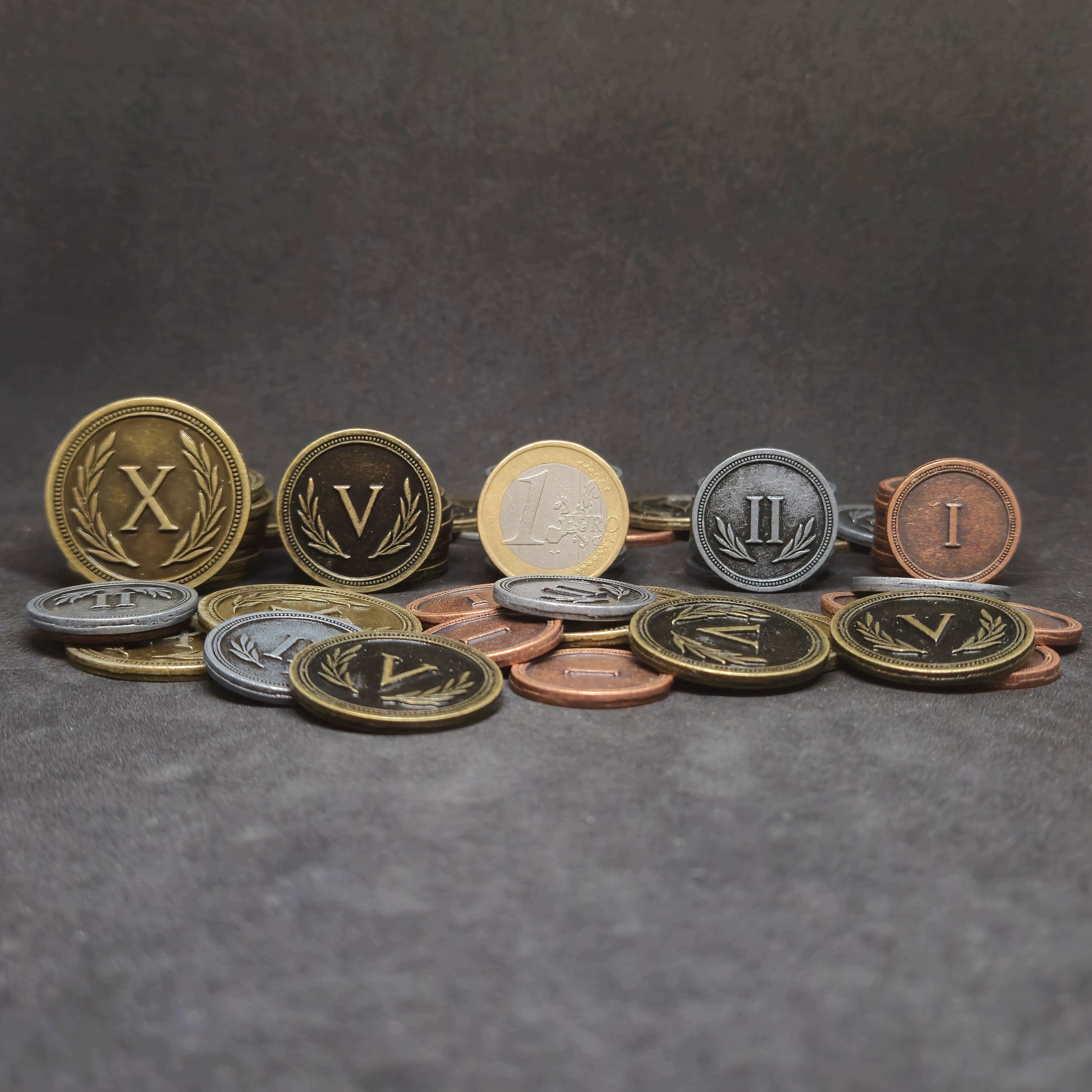 L'avantage des pièces en métal est qu'elles sont bien plus agréables à manipuler que des jetons en plastique ou en bois, elles sont également plus fidèles aux pièces utilisées dans la vie de tous les jours ce qui permet une meilleure immersion dans le jeu.