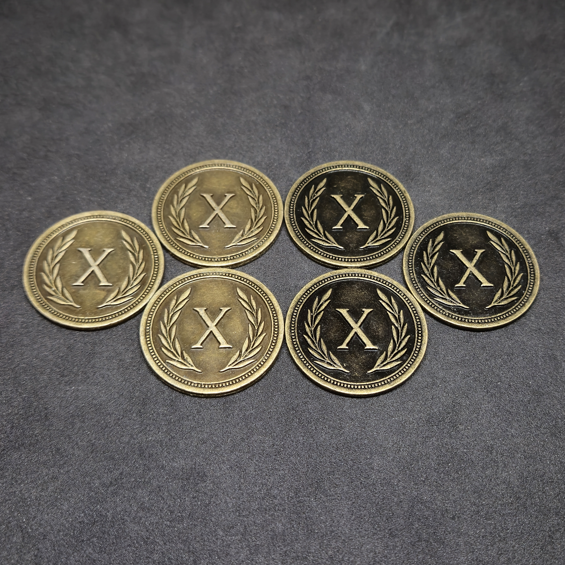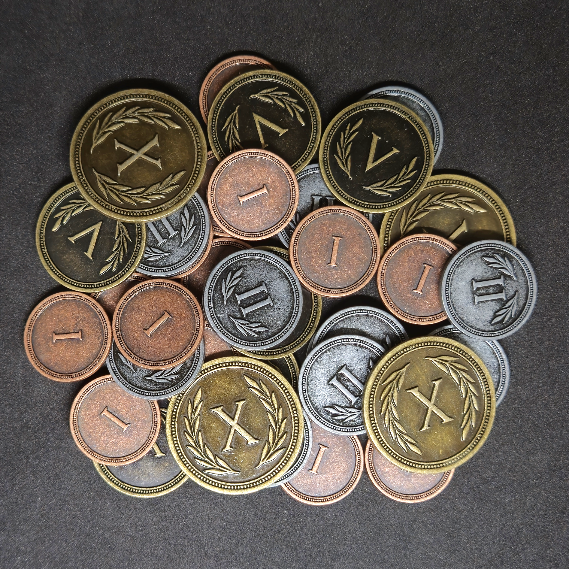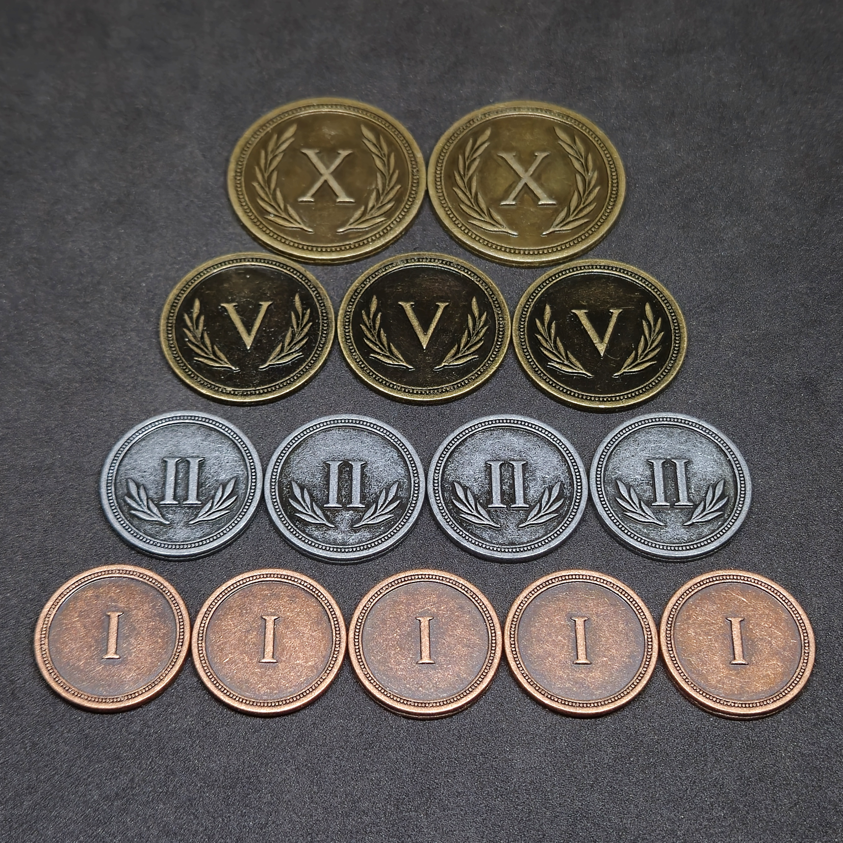 Ensemble de pièces romaines en métal couleur bronze, argent et or de valeur 1, 2, 5 et 10 pour jeux de société