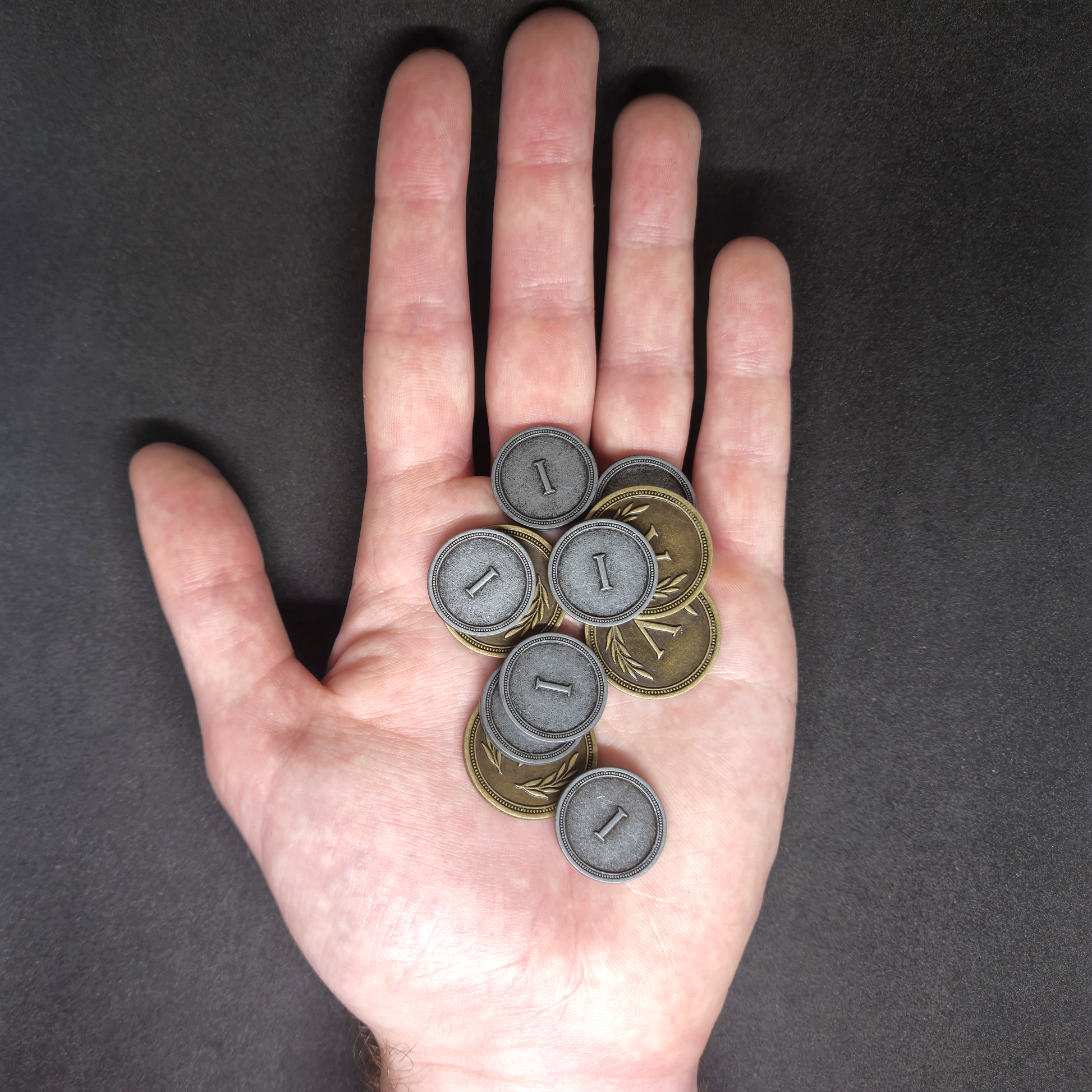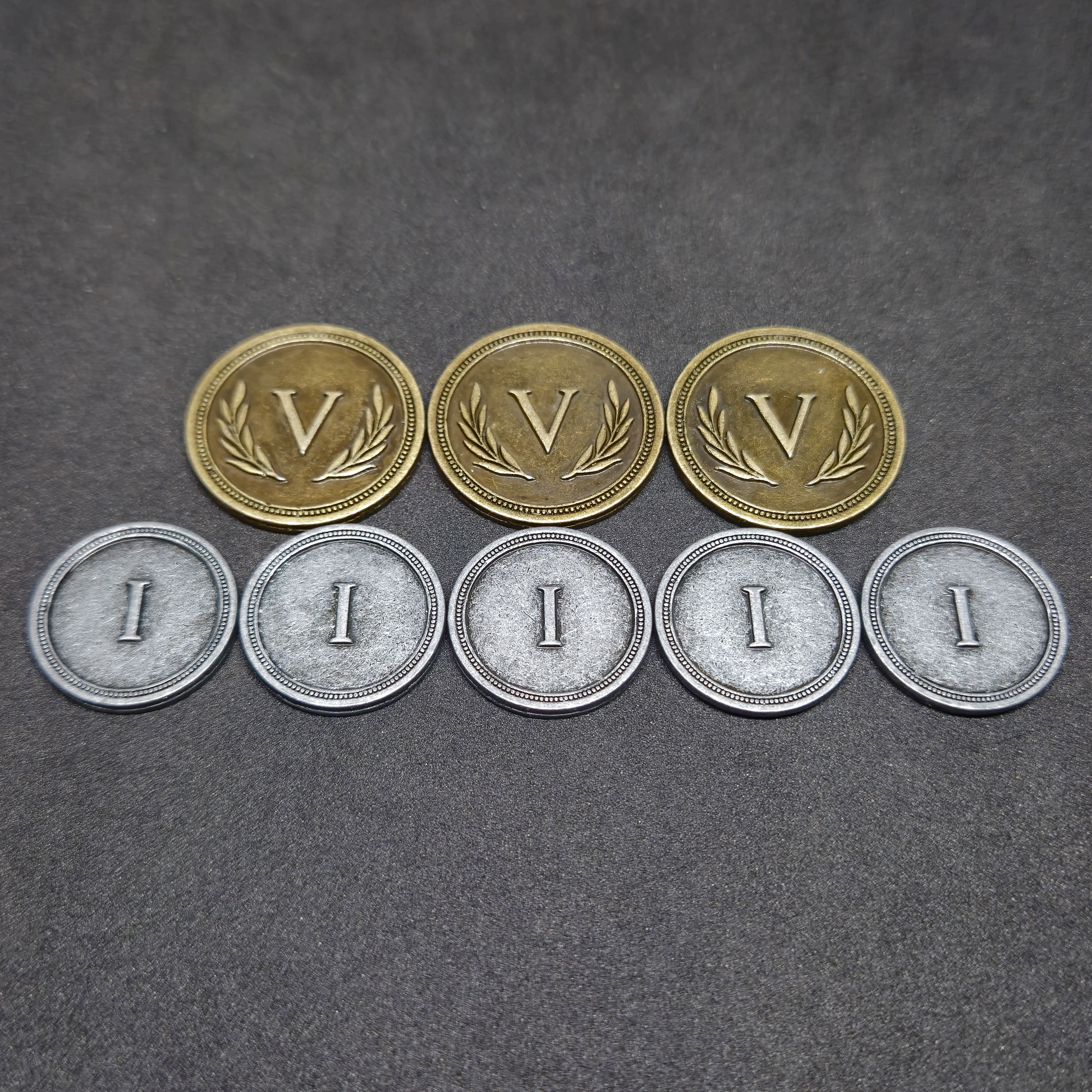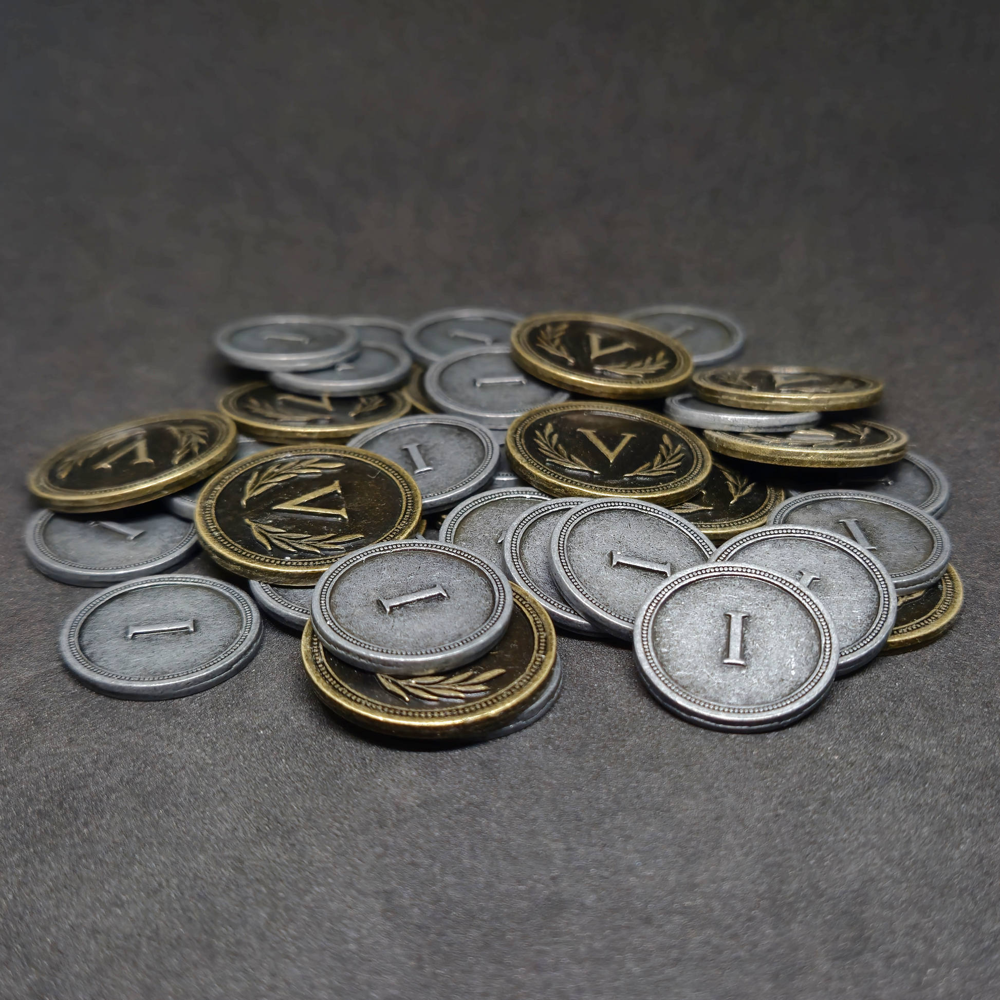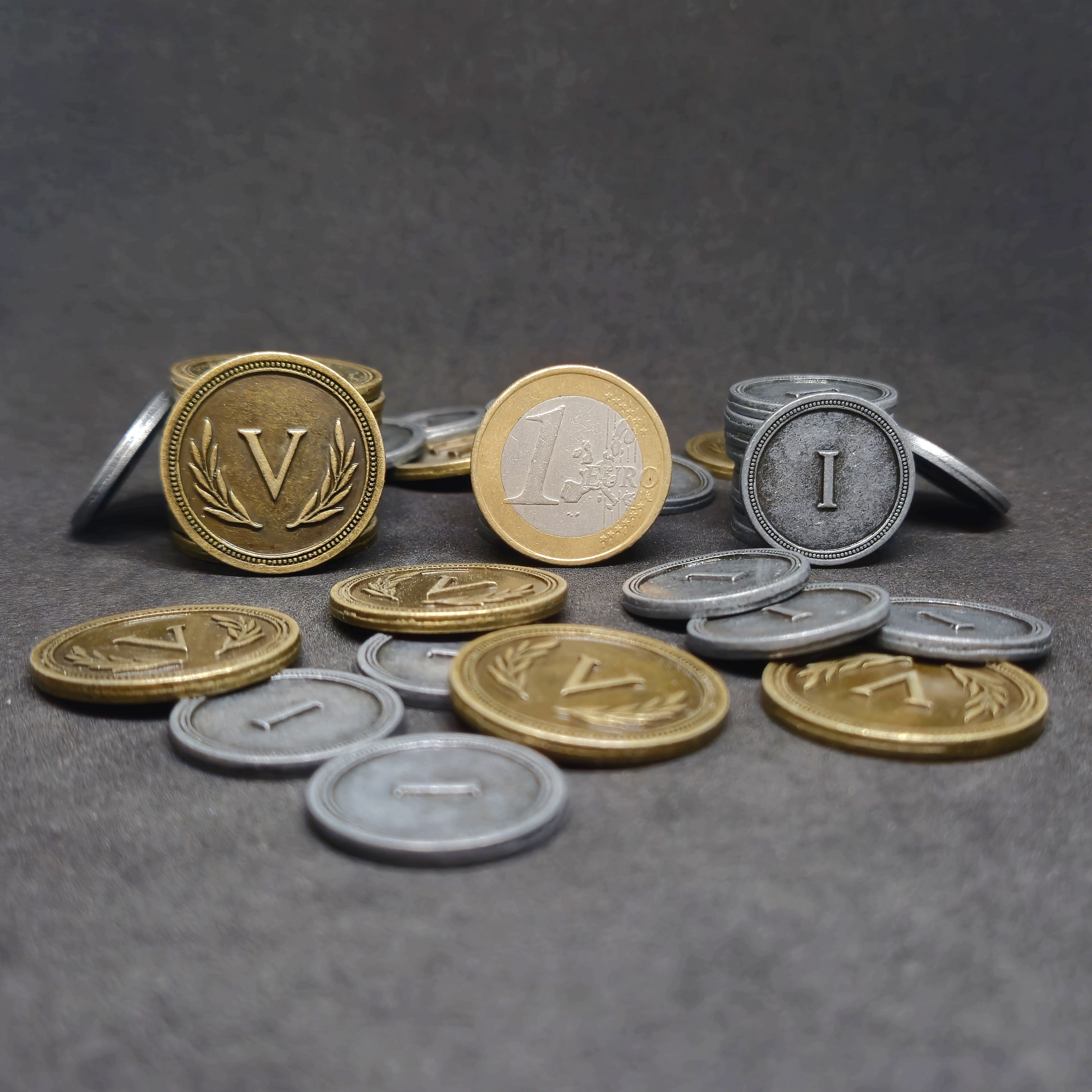 L'avantage des pièces en métal est qu'elles sont bien plus agréables à manipuler que des jetons en plastique ou en bois, elles sont également plus fidèles aux pièces utilisées dans la vie de tous les jours ce qui permet une meilleure immersion dans le jeu.