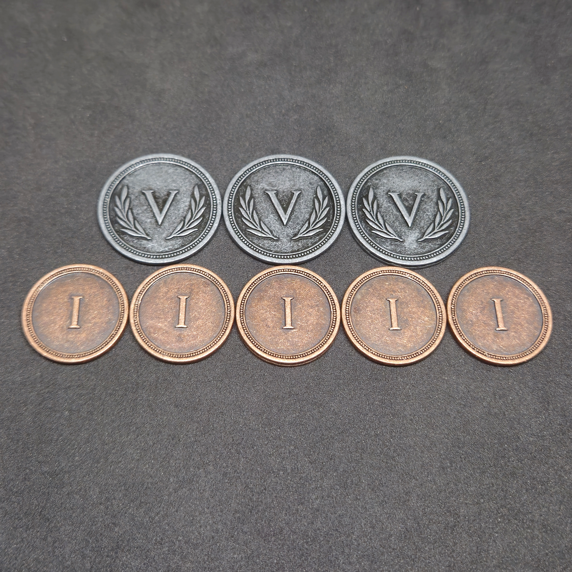 Ensemble de pièces romaines en métal couleur bronze et argent de valeur 1 et 5 pour jeux de société