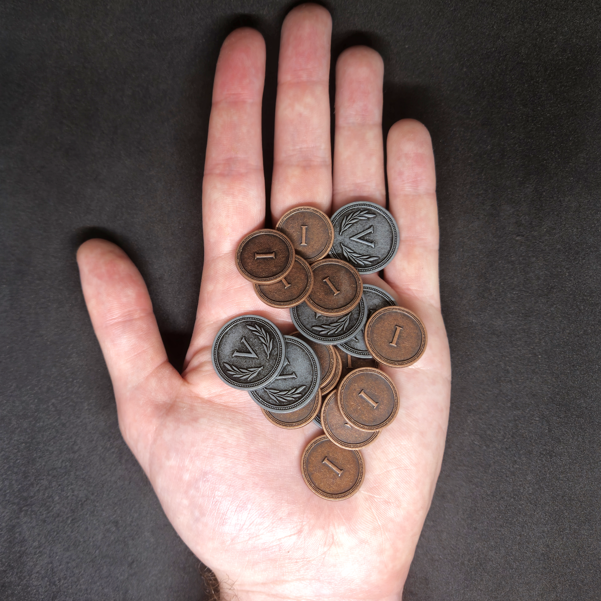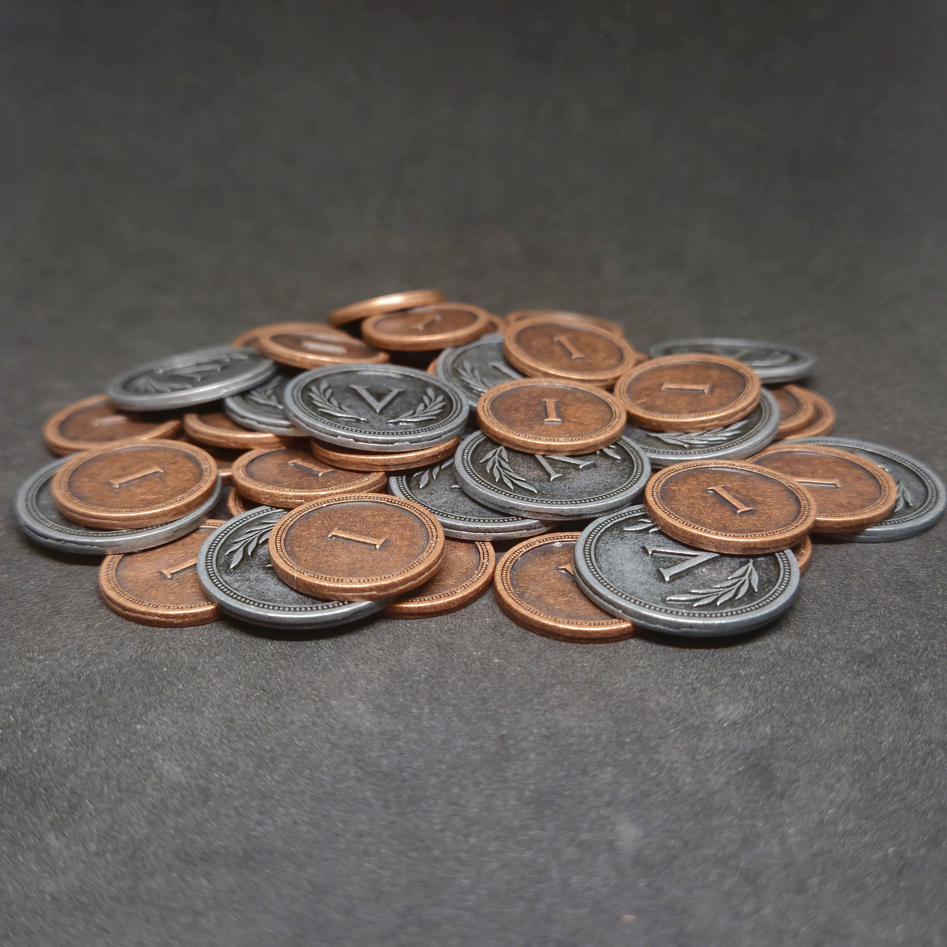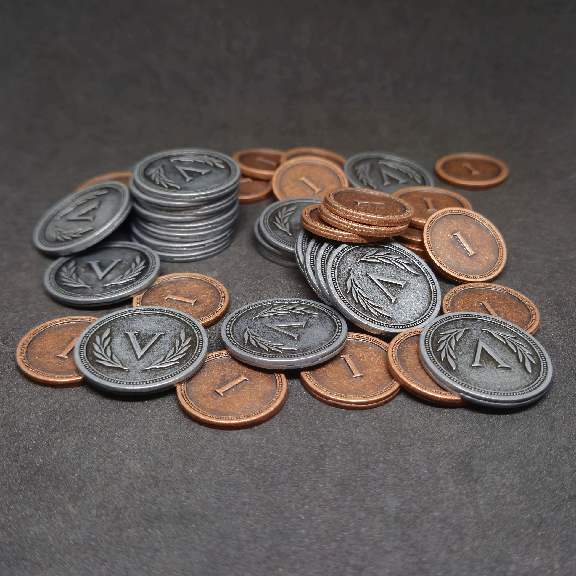 L'avantage des pièces en métal est qu'elles sont bien plus agréables à manipuler que des jetons en plastique ou en bois, elles sont également plus fidèles aux pièces utilisées dans la vie de tous les jours ce qui permet une meilleure immersion dans le jeu.