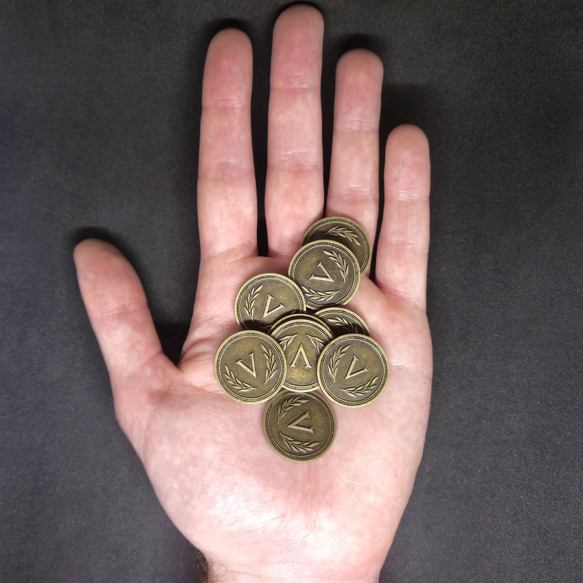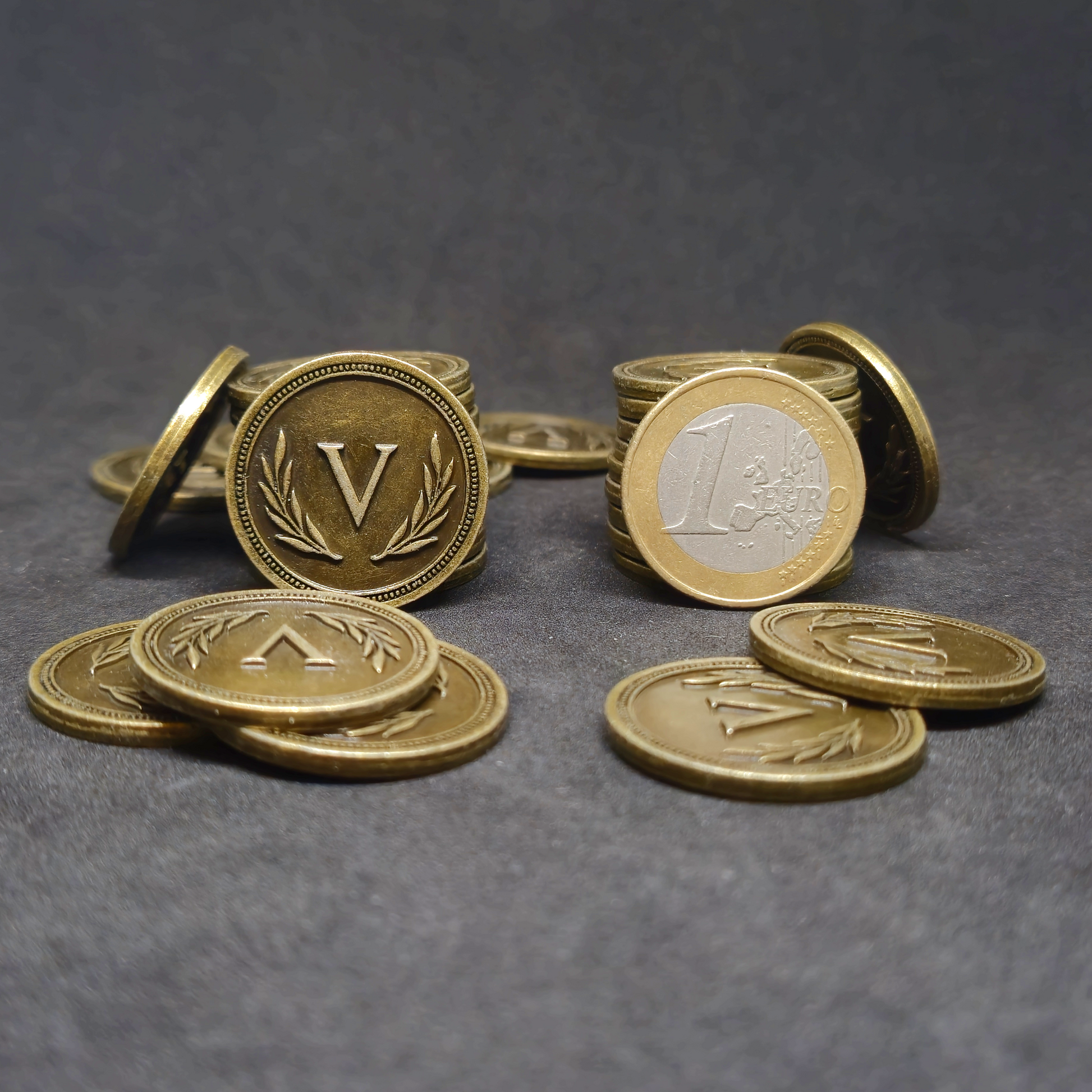 L'avantage des pièces en métal est qu'elles sont bien plus agréables à manipuler que des jetons en plastique ou en bois, elles sont également plus fidèles aux pièces utilisées dans la vie de tous les jours ce qui permet une meilleure immersion dans le jeu.